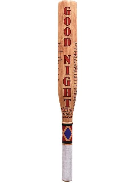 Y es que la psicópata de Harley no lleva las típicas armas tradicionales de cualquier villano. Y el bate de Harley tampoco es el típico bate de béisbol. Ella lo lleva decorado con su propio estilo. Con las palabras «Good Night» grabadas en él y una «original» poesía que pondría los pelos de punta a cualquiera. Además, en el mango de propio bate, se encuentran los característicos rombos de arlequín de Harley Quinn.