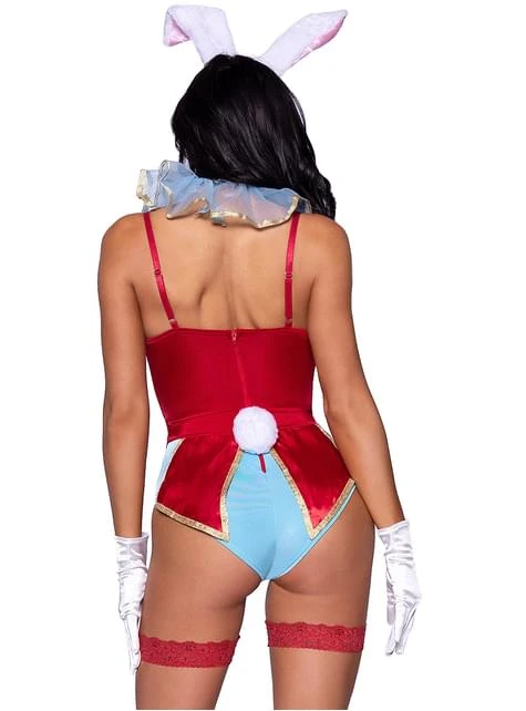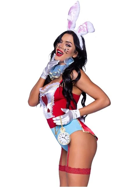 Incluye: Body con liguero a presión con corazón de purpurina y reloj de bolsillo, volante en el cuello, diadema con orejas y cola.