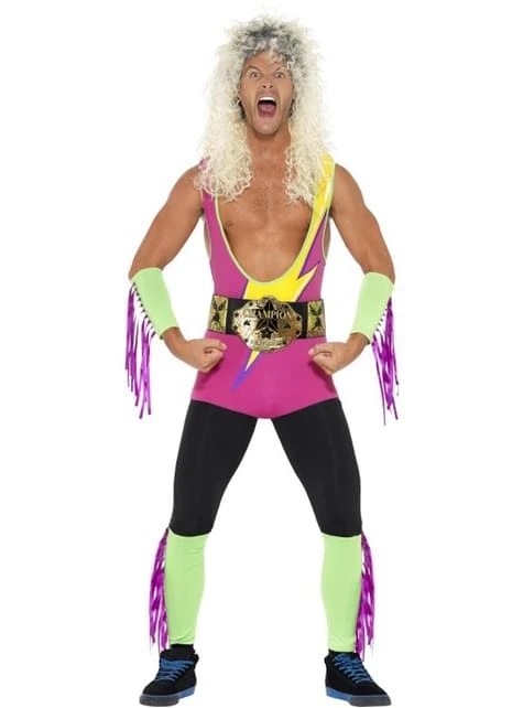 Este asombroso disfraz de luchador retro incluye un mono de licra color morado, amarillo y negro, y dos pares de gemelas color verde para las manos y las piernas.