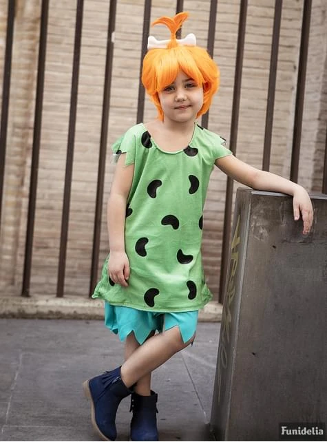 Este vestido de Pebbles para niña cuenta con todos los detalles que le hacen ser idéntico al atuendo de la pequeña de la familia Picapiedra. El disfraz de Pebbles se compone de una camiseta verde sin mangas con manchitas negras en forma de cacahuete y un pantalón corto azul claro. Además, incorpora una peluca naranja con flequillo y coleta puntiaguda aguantada por un hueso.