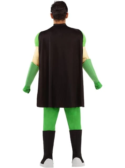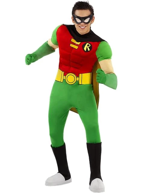 Este es el traje original de los cómics. Este disfraz de Robin es un mono de cuerpo entero musculoso con los pantalones y mangas verdes y el torso en color rojo. Incluye una capa corta de color negro y amarillo en su interior. No le falta ningún detalle: incluye el logo bordado de Robin en el pecho, un cinturón amarillo, unos guantes largos en color verde, cubrebotas de color negro y un antifaz con el que nadie podrá reconocerte.
