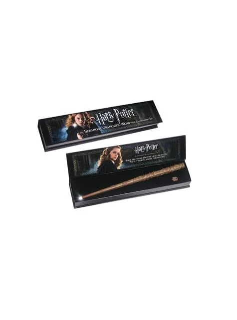 Esta versión luminosa de la varita mágica de Hermione Granger se ilumina al agitarla, y se apaga al agitarla de nuevo. Intensidad regulable. Mide 35 cm aproximadamente, y es vendida con su estuche.
